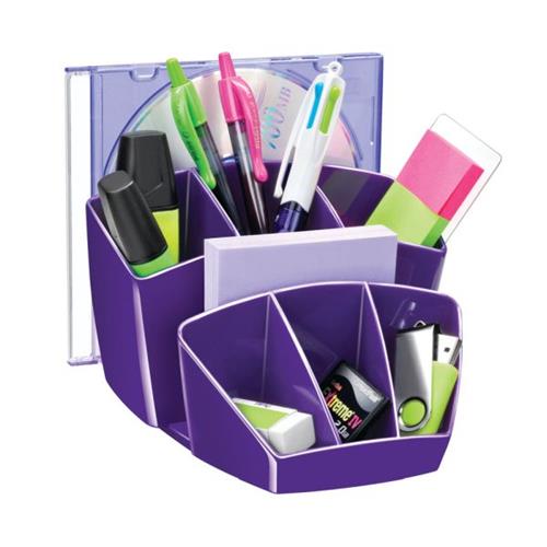 This CEP Pro Gloss desk tidy features 7 compartments for convenient storage of pens, highlighters, sticky notes, pins, scissors and more. Made from shock resistant, high impact polystyrene with a stylish, high gloss finish, the desk tidy also features anti-skid rubber feet for stability. This purple desk tidy measures W143 x D158 x H93mm.