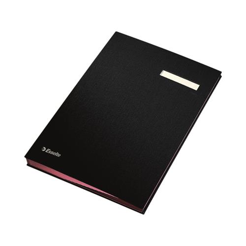 The Esselte standard signature book is ideal for organising documentation such as contracts, invoices and other documents requiring signed approval. Featuring a polypropylene foil coated hardboard cover, the book is durable and contains 20 card dividers with a rough surface to prevent documents from sliding out. Supplied in black, 90% of this signature book is made from 100% recycled material.